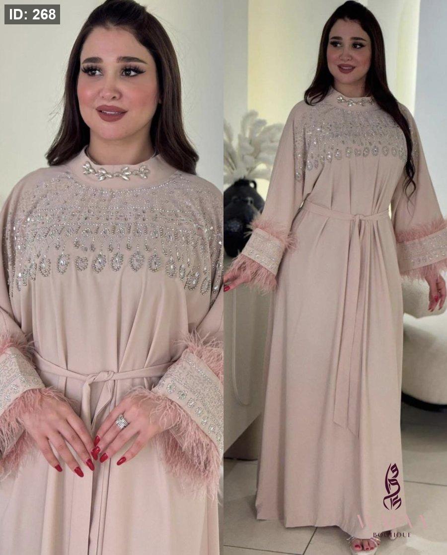 عباية بلون بيج ناعم مزينة بتطريز فاخر وكريستالات لامعة تضيف لمسة من السحر والرقي.